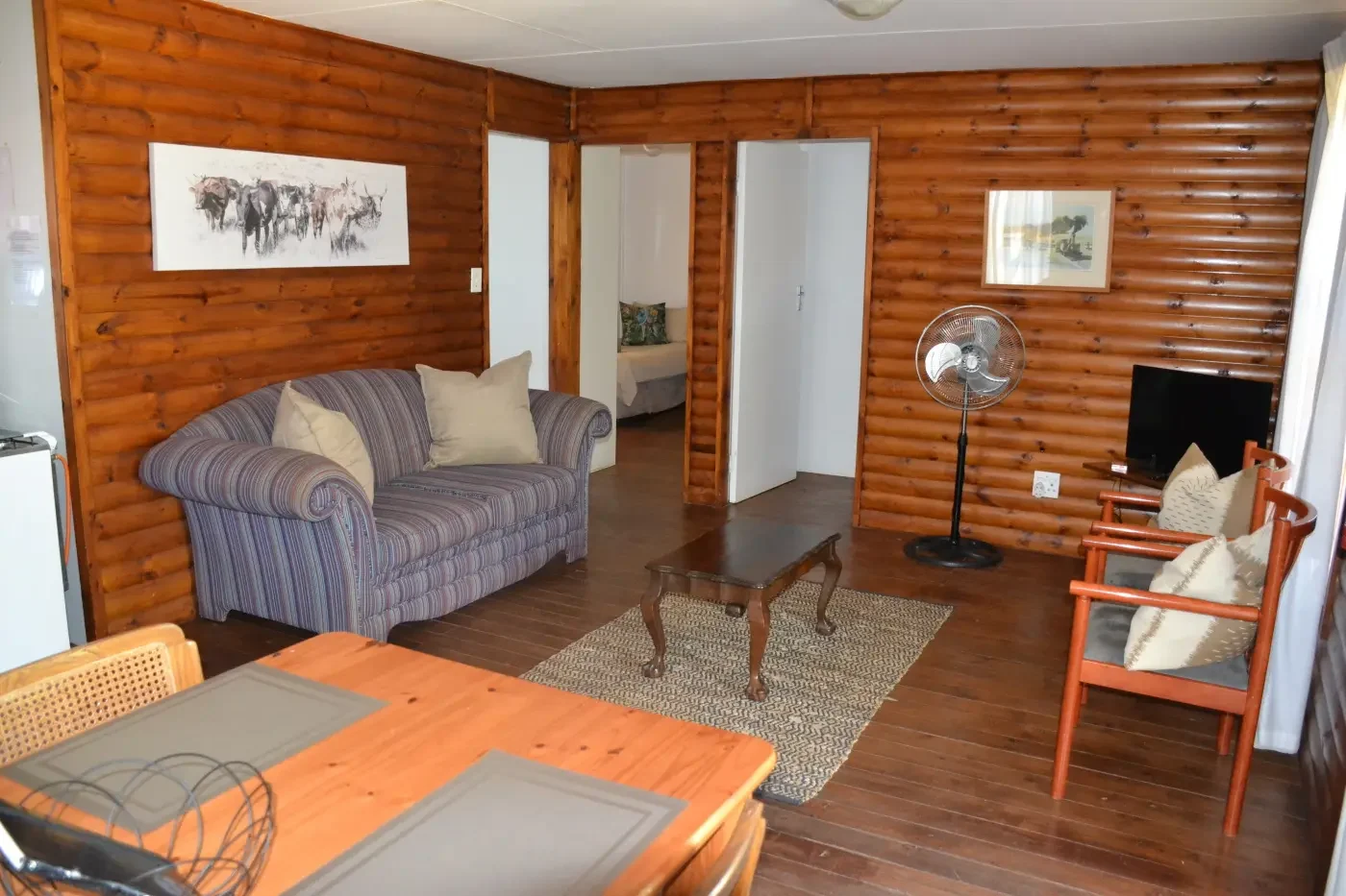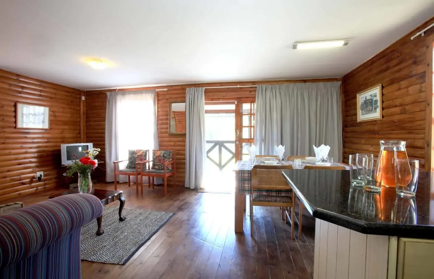 With stairs leading up to the log cabin, it offers 2 bedrooms, a bathroom with a bath and a shower. It includes a living and dining area, a kitchenette with a gas stove and a patio with a view over the dam and the mountain.